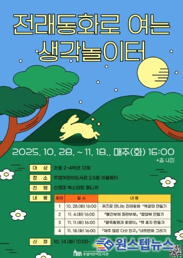 프로그램은 △1회차(10.28.) ‘퀴즈로 만나는 전래동화’와 책갈피 만들기 △2회차(11.4.) '빨간부채 파란부채'와 팝업북 만들기 △3회차(11.11.) '팥죽할멈과 호랑이'와 책 표지 만들기 △4회차(11.18.) '재주 많은 다섯 친구'와 네 컷 만화 그리기로 진행된다.