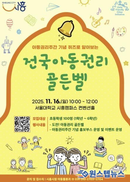 원스텝뉴스 이병희 기자 | 시흥시는 오는 11월 16일 오전 10시, 서울대학교 시흥캠퍼스 컨벤션홀에서 열리는 ‘퀴즈로 알아보는 전국 아동권리 골든벨’에 참가할 초등학생을 10월 31일까지 모집한다.