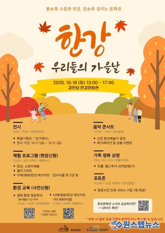 원스텝뉴스 이병희 기자 | K-water한강보관리단과 케이워터운영관리 한강문화관은 오는 10월 18일 가족과 이웃이 함께 즐기는 대표 문화축제 “한강, 우리들의 가을날”를 개최한다고 밝혔다