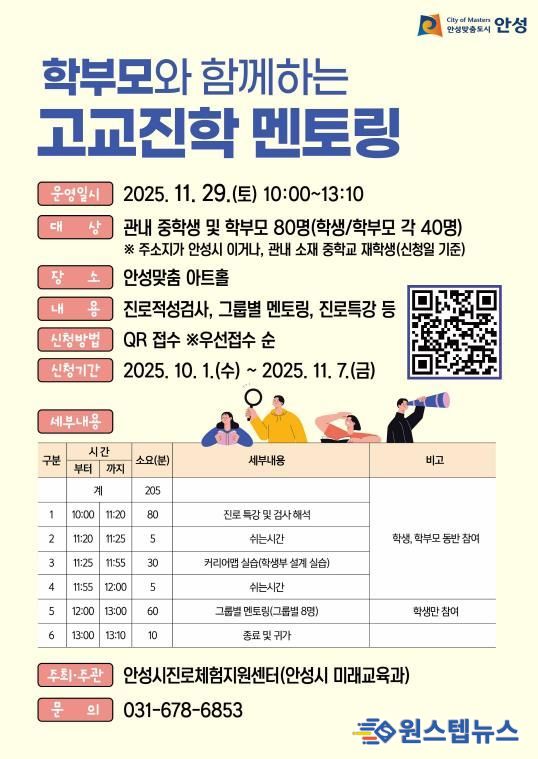 본 프로그램은 안성시 주소지를 두고 있거나 관내 중학교 재학 중인 중학생과 학부모 총 80명을 대상으로 하며, 신청은 10월 1일(수)부터 11월 7일(금)까지 QR코드를 통해 선착순 접수가 가능하다.