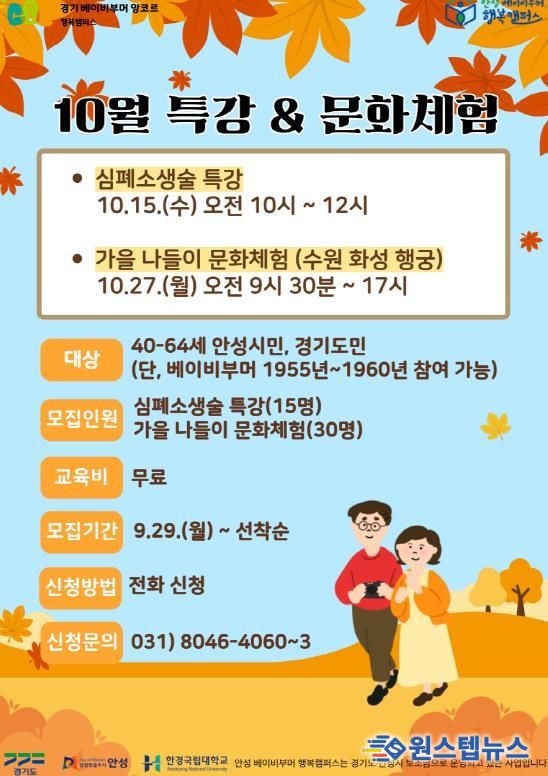 원스텝뉴스 이병희 기자 | 안성 베이비부머 행복캠퍼스(한경국립대학교 평생교육원)는 오는 10월 15일부터 27일까지 중장년 안성시민(경기도민)을 대상으로 ‘10월 특강(심폐소생술) 및 문화체험(수원화성행궁)’ 프로그램을 운영한다고 밝혔다.