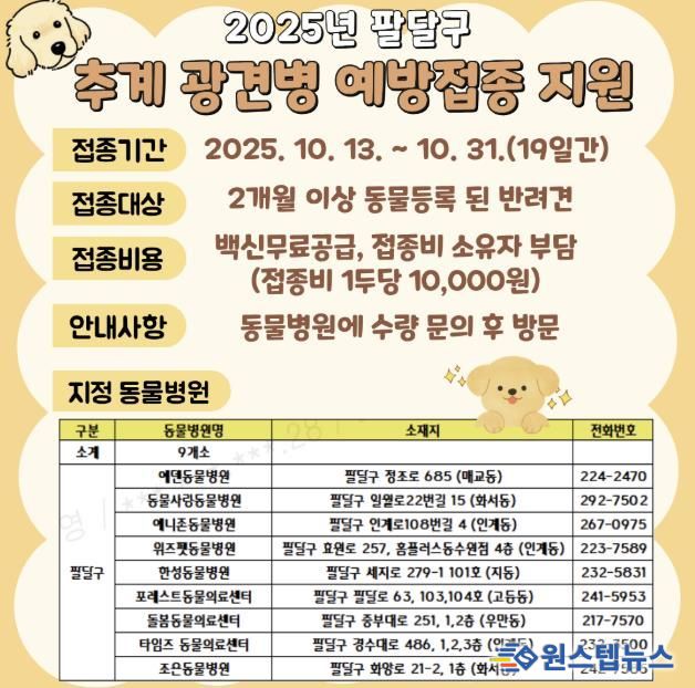 원스텝뉴스 이병희 기자 | 수원시 팔달구는 반려동물을 안전하게 보호하기 위해 10월 13일부터 10월 31일까지 광견병 백신을 무료 지원한다고 밝혔다.