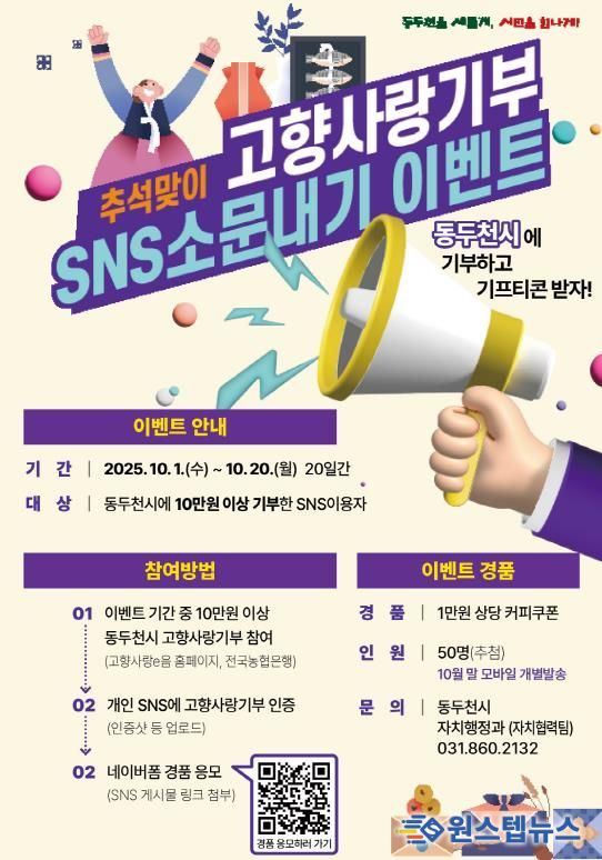 원스텝뉴스 이병희 기자 | 동두천시는 추석 명절을 맞아 고향사랑기부제 취지 확산과 기부 참여 독려를 위해 ‘고향사랑기부 SNS 소문내기 이벤트’를 실시한다.