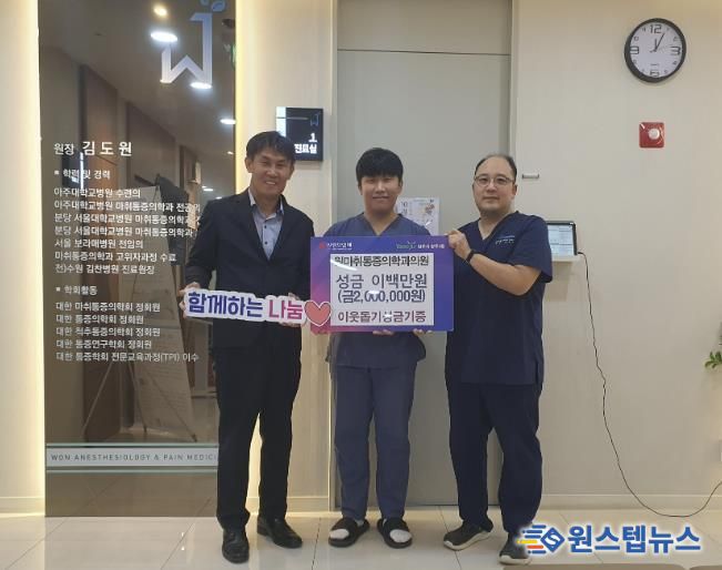 원스텝뉴스 이병희 기자 | 양주시 양주2동이 지난 1일 관내 원마취통증의학과의원에서 추석을 맞이하여 이웃돕기 성금 200만 원을 양주2동에 기탁했다고 밝혔다.