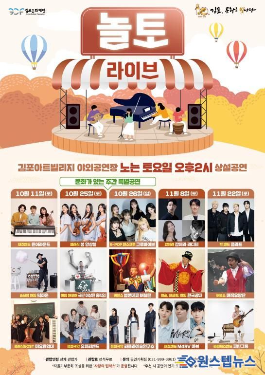 원스텝뉴스 천규영 기자 | (재)김포문화재단은 10월 11일부터 11월 22일까지 매월 둘째, 넷째 주 토요일마다 김포아트빌리지 야외공연장에서 하반기 토요상설공연 '놀토 라이브'를 개최한다고 밝혔다.