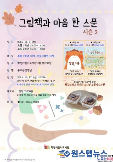 원스텝뉴스 천규영 기자 | 고양특례시 화정어린이도서관은 오는 11월 8일 ‘고소하고 향긋한 보늬밤 보틀케이크’를 만들어보는 그림책 동화요리 프로그램‘그림책과 마음 한 스푼-시즌2’를 운영한다.