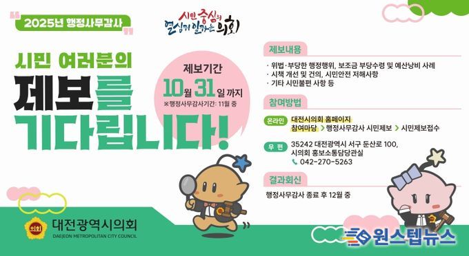 원스텝뉴스 이병희 기자 | 대전시의회는 2025년도 행정사무감사를 앞두고 내실있는 감사를 실시하기 위해 오는 10월 31일까지 다양한 시민 제보를 받는다.
