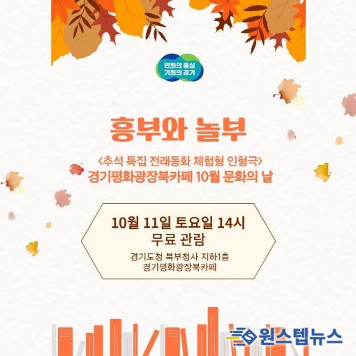 원스텝뉴스 천규영 기자 | 경기도가 오는 10월 11일 경기평화광장 북카페 원형무대에서 추석 연휴를 맞아 전래동화 인형극 공연 ‘흥부와 놀부’를 공연한다. 이번 행사는 ‘10월 문화의 날’ 프로그램으로, 도민에게 명절의 의미를 되새기고 가족과 함께하는 특별한 시간을 제공하기 위해 기획됐다.