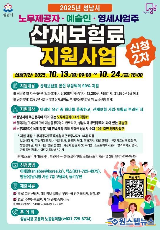 지원 대상은 △ 성남시에 주민등록이 되어 있는 노무제공자(14개 직종)와 예술인, △ 이들과 전속계약 등을 체결한 성남시 소재 10인 미만 영세사업주다. 직종별 월 지원 상한액 범위 내에서 근로자가 납부한 산재보험료 본인 부담금의 90%를 지원한다. 이번 신청 범위는 2025년 4월부터 9월까지의 산재보험료 부과분(최대 6개월분)이며, 기간 외 소급 지원은 불가하다.