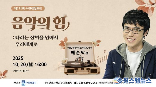 원스텝뉴스 이병희 기자 | MBC 라디오 ‘배철수의 음악캠프’ 배순탁 작가가 10월 20일 오후 4시 시청 대강당에서 열리는 제171회 수원새빛포럼 강사로 나선다.