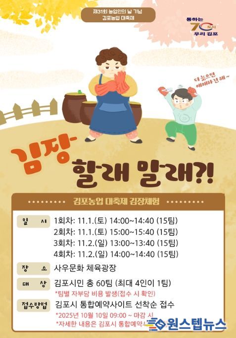 이번 김장체험 행사 참가자는 10월 10일 오전 9시부터 김포시 통합예약사이트를 통해 선착순으로 모집한다.