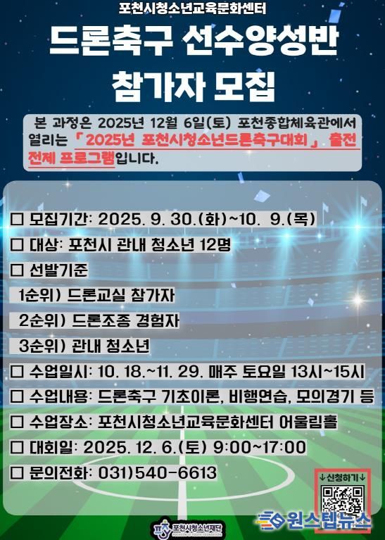 이번 프로그램은 12월 6일 포천종합체육관에서 열리는 ‘2025년 포천시 청소년드론축구대회’에 출전할 선수를 발굴·육성하기 위해 마련했다. 참가 청소년들은 드론축구 기초이론, 비행 연습, 모의 경기 등 체계적인 훈련 과정을 거쳐 최종적으로 대회에 출전하게 된다.