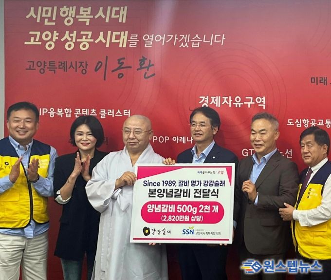 원스텝뉴스 이병희 기자 | ㈜전한의 외식브랜드 강강술래(대표 노상환)가 10월 10일, 고양특례시에 본양념갈비 500g 2,000개(2,820만 원 상당)를 기탁했다. 이번 전달식은 고양특례시청 열린시장실에서 진행됐으며, 이동환 고양특례시장, 김민숙 고양특례시의원(고양, 관산, 원신), 노상환 강강술래 대표, 김응화 고양시사회복지협의회 회장이 함께 자리했다.