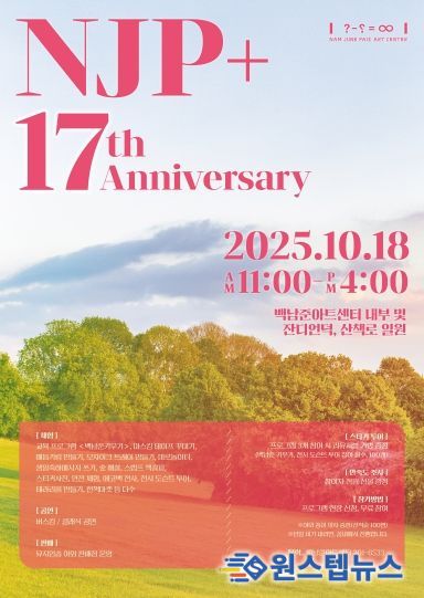 원스텝뉴스 천규영 기자 | 경기문화재단 백남준아트센터(NJP, 관장 박남희)는 2025년 10월 18일, 개관 17주년 기념 축제 'NJP+'를 연다. 특히 이번 행사는 백남준아트센터와 경기도박물관, 경기도어린이박물관으로 이어지는 산책로 환경개선과 맞물려 축하의 의미를 더하고 있다. 아트센터는 올해 시민 예술 교육프로그램인 ‘퍼블릭 아카데미’ 운영, 지역 연계 협력 축제인 ‘제8회 머내마을영화제’ 공동체 상영관 참여, 유휴부지에 공유 정원을 조성하는 ‘이키로(2km) 정원행동 캠페인’ 등 지역과 환경을 잇는 새로운 고객서비스 프로그램을 기획·추진하고 있다.