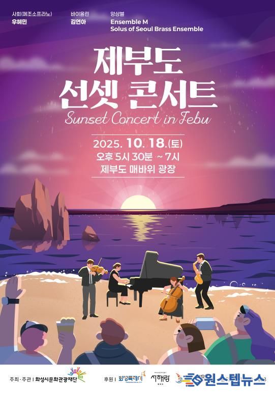 원스텝뉴스 천규영 기자 | 화성시문화관광재단은 아름다운 서해의 석양을 배경으로 클래식 공연 ‘제부도 선셋 콘서트(Sunset Concert in Jebu)’를 오는 10월 18일 5시 30분 제부도 매바위 광장에서 개최한다. 이번 공연은 제부도를 단순 방문지를 넘어 머무는 체류형 관광지로 전환하고, 서해안 관광 활성화의 기반을 마련하는 데 목적이 있다.