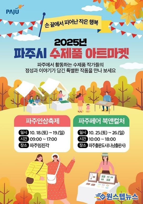원스텝뉴스 이병희 기자 | 파주시는 오는 18일부터 19일까지 이틀간 열리는 ‘파주인삼축제’와 오는 25일부터 26일까지 개최되는 ‘파주페어_북앤컬처’ 행사장에서 지역 수공예 작가들이 참여하는 ‘수제품 아트마켓’을 운영한다.