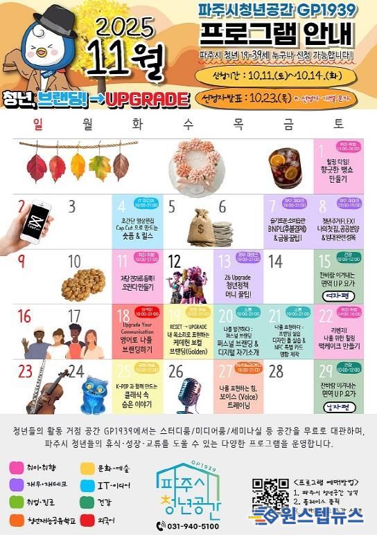 원스텝뉴스 이병희 기자 | 파주시청년공간 지피(GP)1939가 오는 11월 청년 프로그램 참가자를 모집한다.