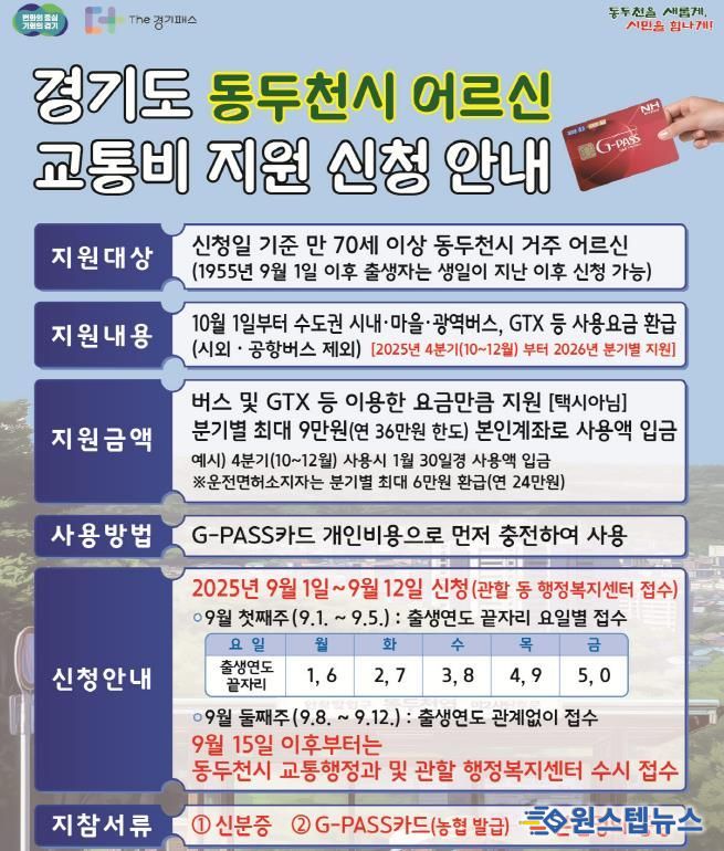 원스텝뉴스 이병희 기자 | 동두천시는 만 70세 이상 어르신의 대중교통비 부담을 덜기 위해 ‘어르신 교통비 지원사업’을 적극 추진하고 있다고 10일 밝혔다.