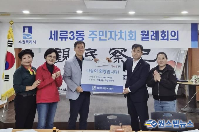 원스텝뉴스 이병희 기자 | 수원시 권선구 세류3동 주민자치회는 지난 10월 1일, 세류3동 행정복지센터에 방문해 추석 명절 세류3동 불우이웃을 위한 100만원 후원금을 전달했다.