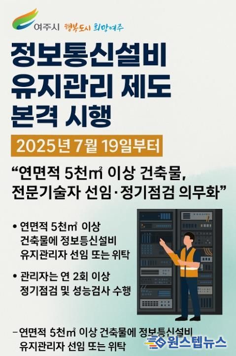 원스텝뉴스 이병희 기자 | 여주시는 지난 7월 19일부터 ‘정보통신설비 유지보수 ‧ 관리제도’를 본격 시행하고있다고 밝혔다. 이번 제도는 일정 규모 이상의 건축물에서 통신설비가 노후되거나 방치돼 시민 불편이 발생하는 사례를 예방하기 위해 마련된 것으로, 통신설비의 체계적 관리와 안전 강화를 목표로 하고 있다.