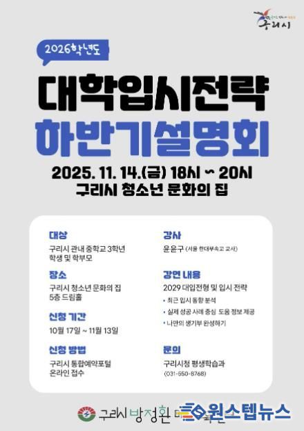 원스텝뉴스 이병희 기자 | 구리시는 ‘2026학년도 대학입시 전략 하반기 설명회’ 참석자를 오는 10월 17일부터 구리시 통합예약 포털을 통해 선착순 110명까지 신청받는다고 밝혔다.