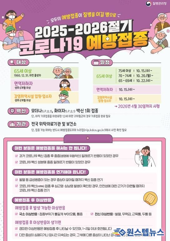 이번 접종은 해마다 변이를 일으키는 코로나19 바이러스에 효과적인 신규 백신 ‘LP.8.1 백신(화이자·모더나)’을 활용해 진행되며, 고위험군 시민의 면역 형성을 돕고 지역사회 전파를 최소화하기 위해 마련된 조치다.