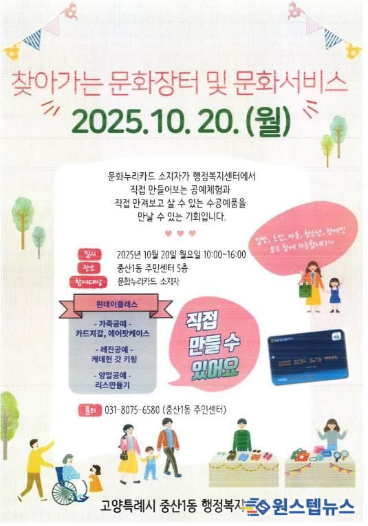 원스텝뉴스 이병희 기자 | 고양특례시 일산동구 중산1동은 문화누리카드 사용에 불편을 겪는 지역주민을 위해 오는 20일 오전 10시부터 오후 4시까지 청사 5층 다목적실에서‘찾아가는 문화장터 및 문화서비스’를 개최한다.