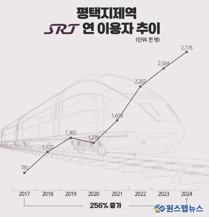 평택지제역은 2016년 개통 당시부터 SRT가 정차한 역사로, 매년 이용객 수가 꾸준히 증가하고 있다. 실제 ‘철도연감’에 따르면 평택지제역의 연간 SRT 승하차 인원은 2017년 78만 1천 명이었지만, 2024년에는 277만 8천 명으로 256%의 증가율을 기록했다. 이러한 증가율은 SRT 역사 중 가장 높은 수치다.