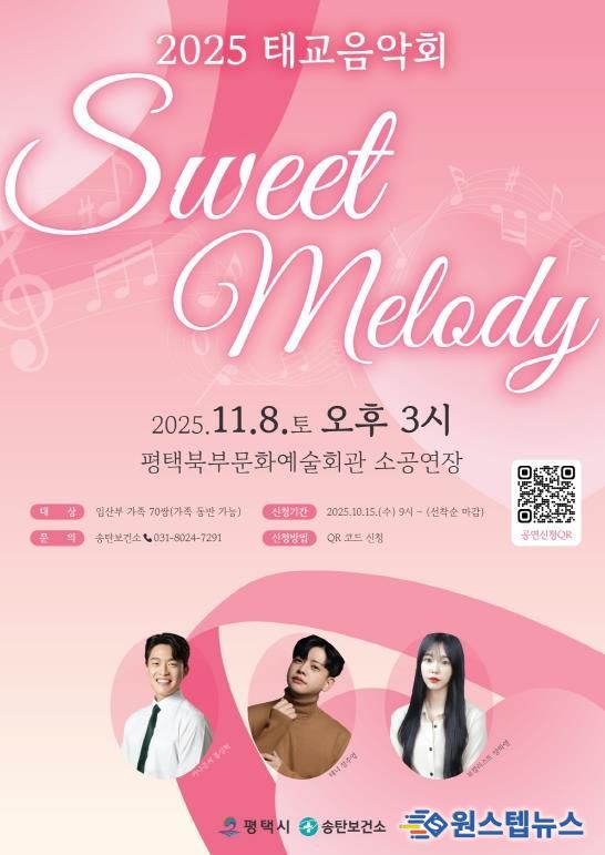 원스텝뉴스 이병희 기자 | 평택시 송탄보건소는 임산부 가족의 정서적 안정과 행복한 출산 환경조성을 위해 오는 11월 8일 ‘2025 태교 음악회『Sweet Melody』’를 개최한다.