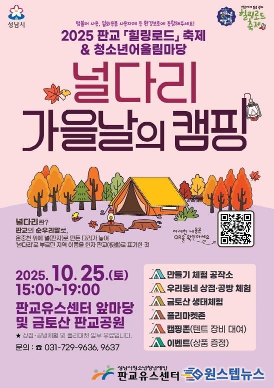 원스텝뉴스 천규영 기자 | 성남시청소년청년재단 판교유스센터는 10월 25일, 오후 3시부터 7시에 판교유스센터 앞마당 및 판교공원에서 ‘판교 힐링로드 축제와 청소년어울림마당’ 을 개최한다.