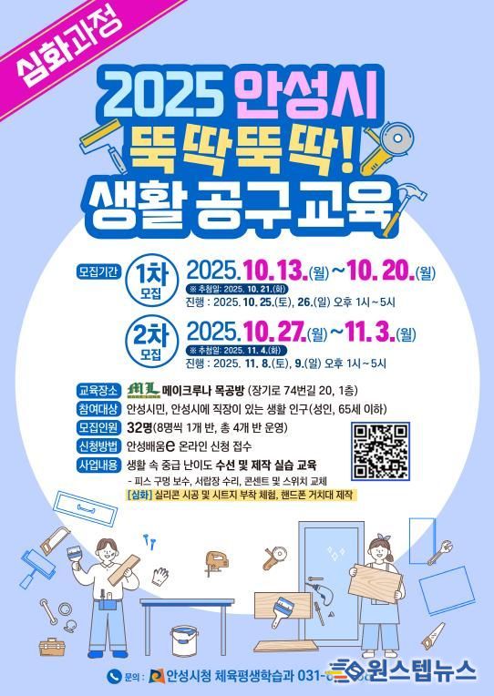 안성시 관계자는 “누구나 참여할 수 있는 과정이지만, 난이도를 높여 실제 생활에서 자주 접하는 문제를 해결할 수 있는 기술 습득에 중점을 두었다”며, “시민들의 생활 자립 역량을 한층 강화하는 기회가 될 것”이라고 말했다.