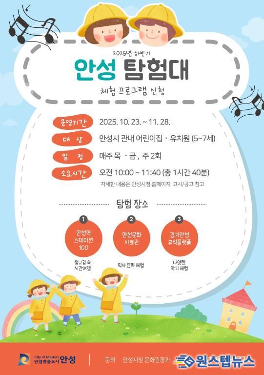 원스텝뉴스 이병희 기자 | 안성시는 상반기에 시범 운영해 큰 호응을 얻은 유아 대상 체험형 프로그램 ‘안성 탐험대: 역사 속으로, 음악 속으로!’를 하반기에도 운영하며, 지역 문화시설 활성화에 나선다.