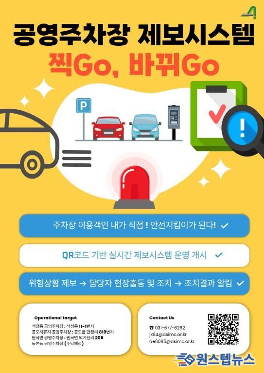 원스텝뉴스 이병희 기자 | 안성시시설관리공단은 10월 10일부터 원곡면, 석정동, 공도 저류지, 동본동(수탁예정)공영주차장 4개소 대상으로, 이용객이 직접 주차장의 위험요소나 이용 불편사항을 손쉽게 제보하고 개선에 참여할 수 있는 QR 코드 기반의 실시간 위험상황 제보시스템 “찍Go, 바뀌Go”를 운영한다고 밝혔다.
