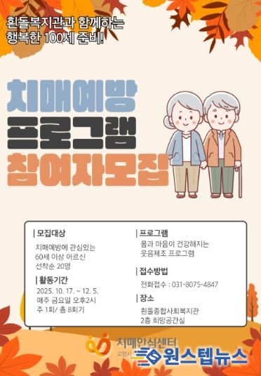 원스텝뉴스 이병희 기자 | 고양특례시 일산동구보건소 치매안심센터는 치매안심마을로 지정된 백석2동 흰돌복지관에서 운영되는 치매예방교실‘기억안심, 웃음활짝’의 참가자를 모집한다고 밝혔다.