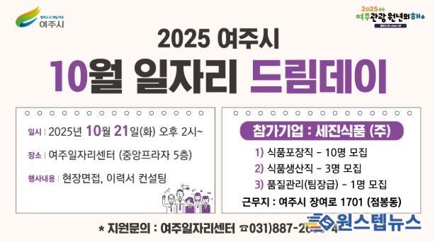 원스텝뉴스 이병희 기자 | 여주시는 오는 10월 21일 오후 2시 여주일자리센터(세종로 14번길 18, 중앙프라자 5층)에서 ‘2025년 10월 일자리드림데이’를 연다.