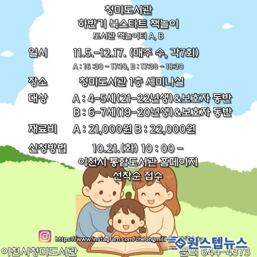 원스텝뉴스 천규영 기자 | 이천시 청미도서관은 오는 11월 5일부터 12월 17일까지, 유아와 보호자를 대상으로 ‘하반기 북스타트 책놀이’ 프로그램을 운영한다.