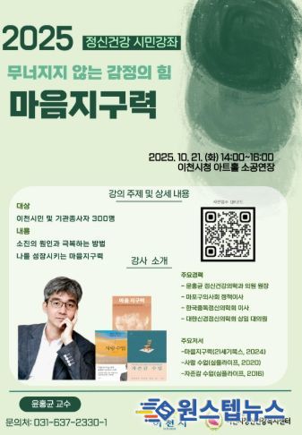 원스텝뉴스 이병희 기자 | 이천시정신건강복지센터는 오는 10월 21일 오후 2시부터 4시까지 이천아트홀 소공연장에서 2025년 정신건강 시민강좌 ‘무너지지 않는 감정의 힘, 마음 지구력’을 개최한다. 이번 강좌는 취업, 학업, 결혼 등 다양한 스트레스 환경 속에서 살아가는 이천 시민들에게 마음 건강의 중요성을 알리고 정신건강 회복의 계기를 마련하기 위해 기획됐다.