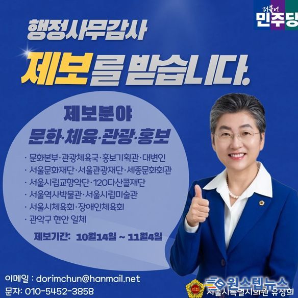 원스텝뉴스 이병희 기자 | 서울특별시의회 문화체육관광위원회 유정희 의원(더불어민주당, 관악4)은 10월 14일부터 11월 4일까지 시민 의견을 직접 접수받는 ‘행정사무감사 시민제보창구’를 운영한다고 밝혔다.