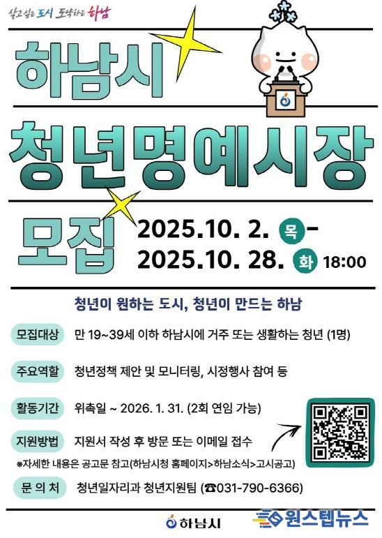 원스텝뉴스 이병희 기자 | 하남시가 청년의 시선으로 시정을 함께 만들어갈 ‘청년명예시장’을 오는 10월 28일까지 공개 모집한다.