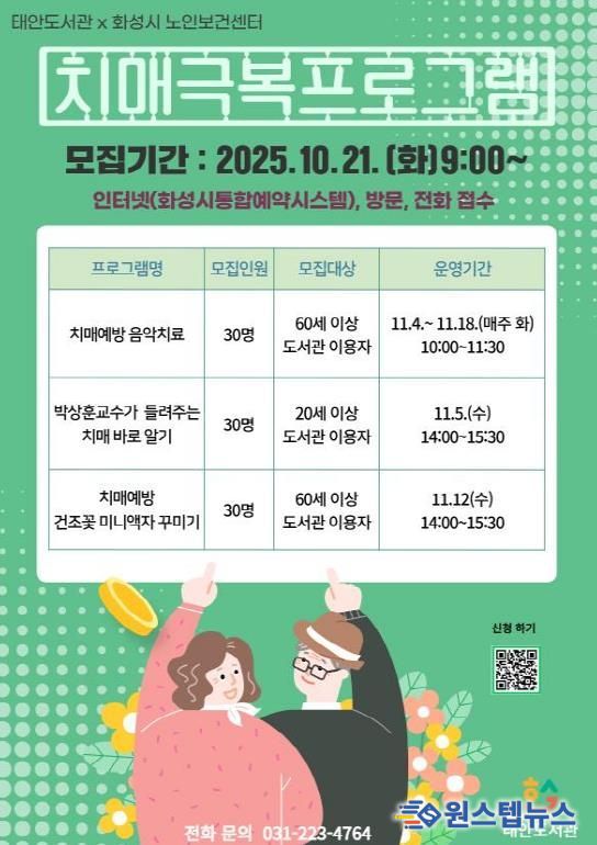 원스텝뉴스 이병희 기자 | 화성시문화관광재단 운영 화성시립태안도서관은 10월 14일부터 11월 18일까지 지역 어르신의 건강한 노년을 지원하기 위한 ‘치매극복 프로그램’을 운영한다.
