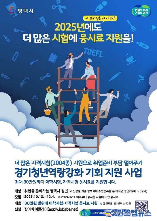 원스텝뉴스 이병희 기자 | 평택시는 관내 미취업청년들에게 더 고른 취업 기회를 제공하기 위해 어학·자격시험 응시료 지원 사업인 ‘경기청년 역량 강화 기회 지원 사업’의 참여자를 추가 모집한다고 밝혔다.