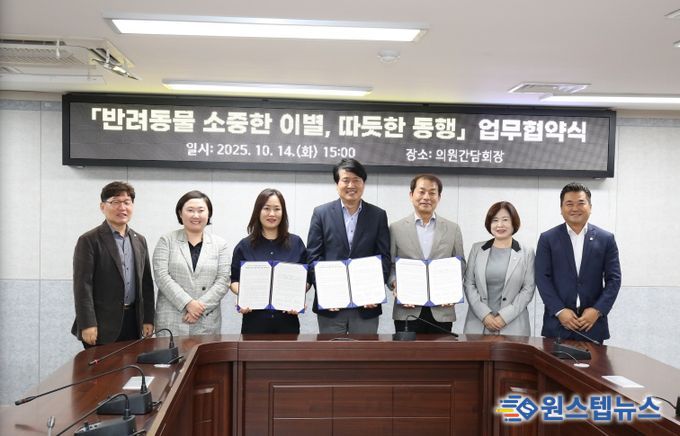 원스텝뉴스 이병희 기자 | 인천 서구는 14일 관내 동물장묘업체와 함께 ‘반려동물 소중한 이별, 따뜻한 동행’을 주제로 반려동물 장례문화 지원 업무협약을 체결했다. 이번 협약은 서구의회 의원연구단체인 서구반려동물정책연구회가 공동발의해 전국 최초로 제정한 ‘인천광역시 서구 반려동물 장례문화 지원 조례’를 근거로 진행됐다는 점에서 의미가 크다.