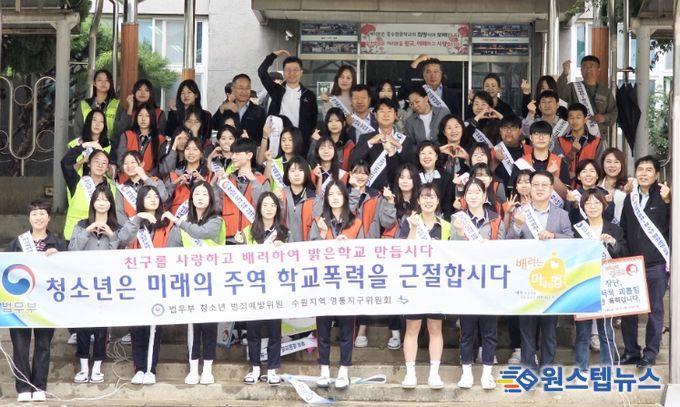원스텝뉴스 이병희 기자 | 수원시 영통구는 14일 동수원중학교 정문에서 법무부 청소년범죄예방위원 수원지역 영통지구위원회(이하 ‘범방위’, 회장 이윤희)와 동수원중학교 재학생, 교직원, 학부모회 등 50여명이 참여하여 ‘등굣길 청소년 선도 캠페인’을 실시했다.