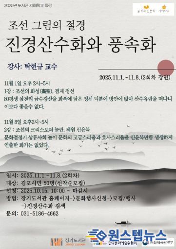 원스텝뉴스 천규영 기자 | 김포시 장기도서관은 2025년 도서관 지혜학교 특강으로 '조선 그림의 절경 진경산수화와 풍속화'를 오는 11월 1일, 11월 8일 오후 2시부터 5시까지 장기도서관 대강당에서 운영한다고 밝혔다