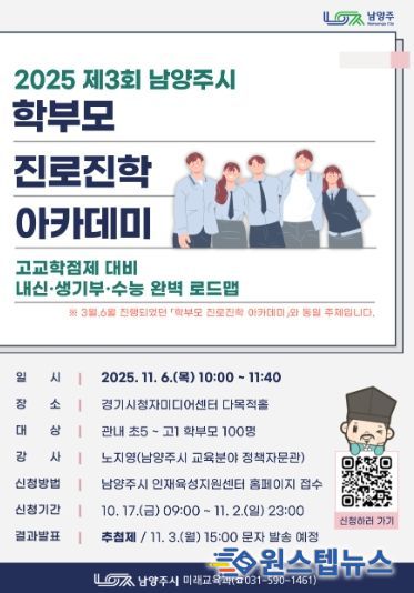 원스텝뉴스 천규영 기자 | 남양주시는 오는 11월 6일 경기시청자미디어센터 다목적홀에서 열리는 ‘학부모 진로진학 아카데미’ 참여자를 10월 17일부터 11월 2일까지 모집한다고 밝혔다.