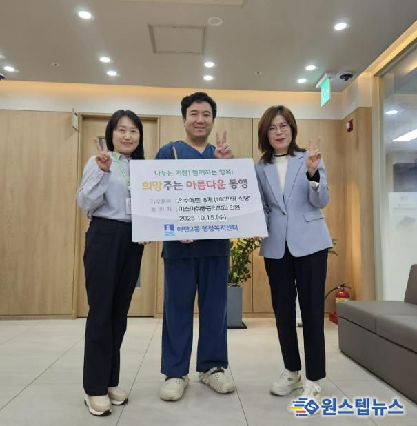 원스텝뉴스 이병희 기자 | 지난 15일, 수원시 영통구 소재 미소마취통증의학과의원은 관내 저소득 어르신들이 따뜻한 겨울을 보낼 수 있도록 매탄2동 행정복지센터에 100만원 상당의 온수매트 8세트를 기부했다.