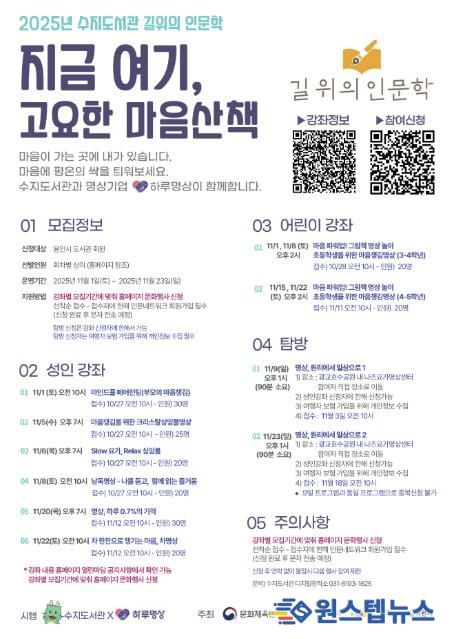 원스텝뉴스 이병희 기자 | 용인특례시 수지도서관은 오는 11월 1일부터 23일까지 ‘2025년 길 위의 인문학’ 프로그램 ‘지금 여기, 고요한 마음 산책’을 운영한다고 17일 밝혔다.