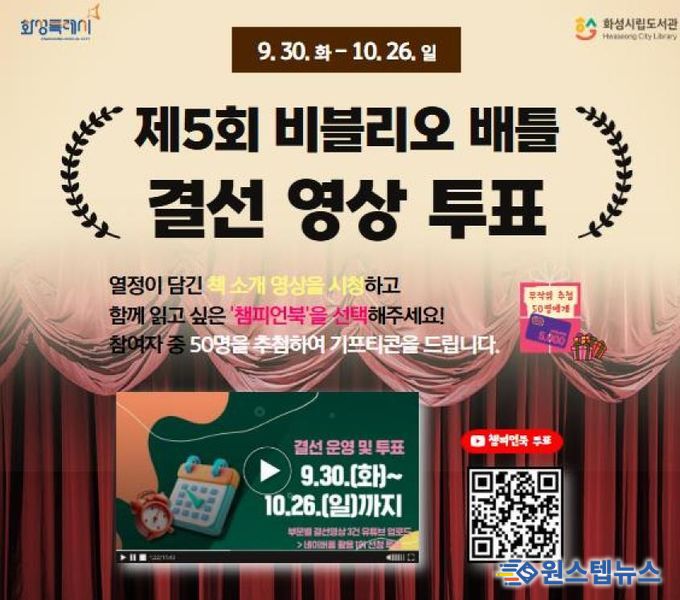 원스텝뉴스 천규영 기자 | 화성시문화관광재단은 오는 10월 26일까지 '제5회 비블리오 배틀' 결선 영상투표를 진행한다.