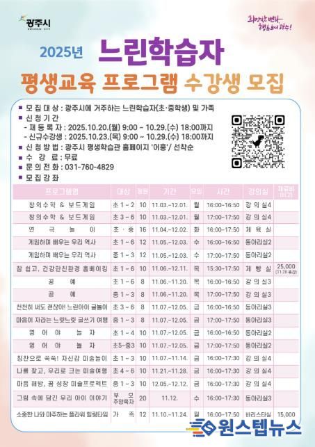 프로그램은 11월 3일부터 12월 12일까지 운영되며 총 10개 분야로 구성됐다. 수강생 모집은 10월 20일 오전 9시부터 광주시 평생학습포털 ‘어흥’에서 선착순으로 신청받는다.