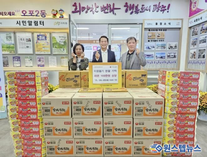 원스텝뉴스 이병희 기자 | 광주시 양벌동 e편한세상 아파트 입주민들은 지난 16일 광주시 오포2동을 방문해 어려운 이웃을 돕기 위한 라면(160만 원 상당)을 기탁했다.